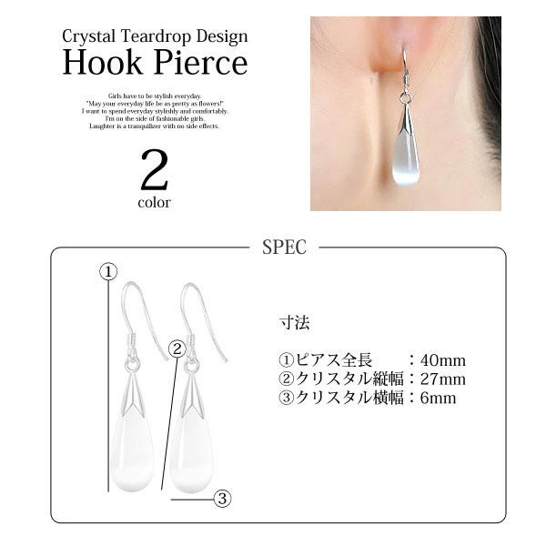 <<スーパーSUMMER SALE>>★水晶を涙型のようなデザインにしたピアス!!2色展開!★シンプルでさわやかで付けやすいピアスです。これからの季節にピッタリなアイテム!どんなコーデにも合うオススメピアスです!■商品詳細■(画像:8枚目参照)ピアス全長:約40mmクリスタル縦幅:約27mmクリスタル横幅:約6mm※注意事項※商品画像はできる限り実物の色に近づけておりますが、モニター・パソコン等の画像解像度により実際の商品と多少色味が異なる場合がございます。サイズは平置きサイズとなりますので、測り方により誤差が出る場合がございます。予めご了承くださいますようお願いいたします。