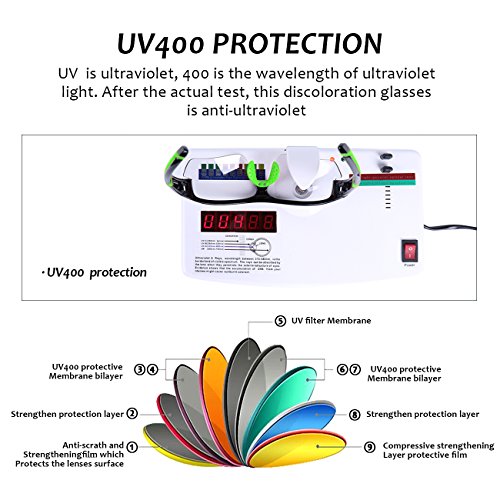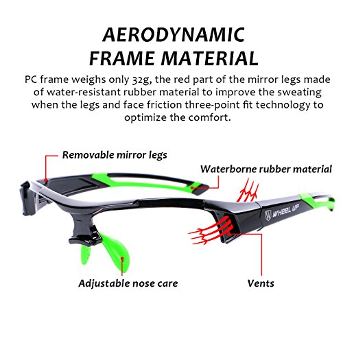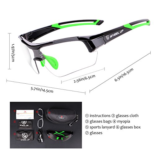 Studio : WHEEL UP Publisher : WHEEL UP Product Description Packing list 1 Glasses with transparent photochromic lens 1 Glasses Case 1 Lens cloth 1 Glasses bags 1 Myopia frame Specifications 1.Lens Material:PC Explosion-proof lens 2.Color:Red,Blue,Green 3.Weight:0.07lb(0.03kg) 4.Adjustable plastic nose pads 5.PC frames 6.Removable temples 7.Visual range Feature 1.Photochromic,discoloration 2.PC explosion-proof lens 3.Removable temples 4.Anti-UV 5.High transmittanceprotect eyes Notice Lens color has a process of riding the same time in the tunnel.It is recommended that the glasses should be lifter to avoid confusion. Applicable Motorcycle and cycling bicycle, driving, running, fishing, racing, skiing,hiking , climbing, jogging, trekking or other outdoor activities enthusiasts.