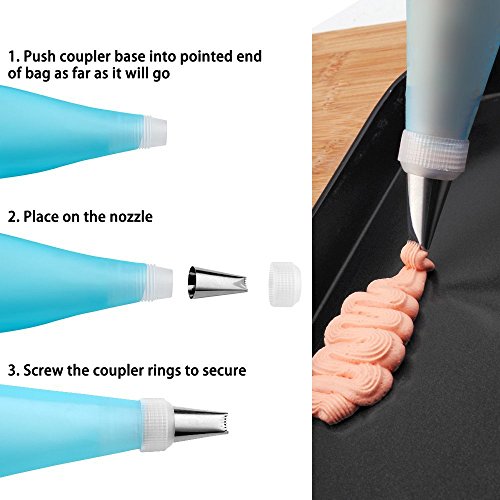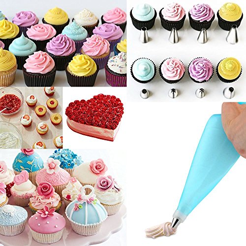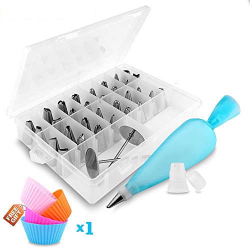 Product Description32 Pieces Cake Decorating Kit with 32 Icing Tips, 2 Silicone Pastry Bags, 2 Flower Nails, 2 Reusable Plastic Couplers and 4 Muffin cups for free0