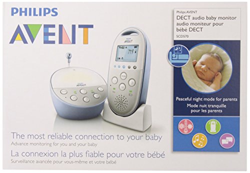 Advanced monitoring for you and your baby, with night light and lullabies, and with vibration alert and docking station for the parent unit. The Philips AVENT scd570/10 baby monitor delivers a reliable connection to your baby. DECT technology guarantees zero interference from any other transmitting product like other baby monitors, cordless phones and cell phones. It also provides high quality, crystal clear sound so you can hear your baby anytime. Data encryption provides a secure and private connection. A customized temperature sensor allows you to monitor the climate in baby's room, immediately alerting you, through the digital display on the parent unit, if the climate changes, as your baby cannot regulate her body temperature as well as you can and will get restless even with a slight change in temperature. If your baby is restless when you put them to bed, you can help soothe and calm your baby to sleep with the warm tranquil glow of the night light or you can select one of five gentle lullabies. Other great features include sound activated lights to indicate the level of sounds in baby's room, the ability to talk back to your baby, a range of up to 330 meters, a rechargeable wireless unit that with a comfortable deck cord so you can move around the house, a docking station that allows you to recharge the parent unit, and an alert on the parent unit when power is low or if you're out of range.Feature