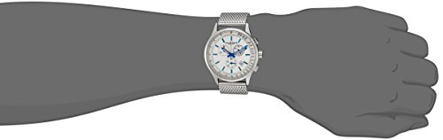 -. Feature : Round watch with a white dial featuring cobalt contrasts, three chronograph subdials, and date window at 4:30 position / 42.5mm stainless steel case with mineral dial window / Swiss quartz movement with analog display / Stainless steel mesh band with hook buckle clasp / Water resistant to 165 ft (50m) / Round watch in stainless steel with white dial featuring cobalt contrasts and mesh band / Swiss quartz movement with analog display / Protective mineral crystal dial window / Features buckle closure, logo on dial date window, and 30-minute, 60-second, and date subdial / Water resistant to 165 feet (50 M): suitable for swimming and showering
