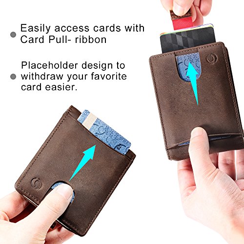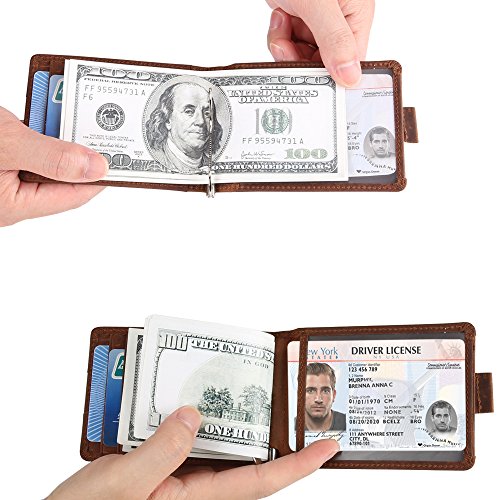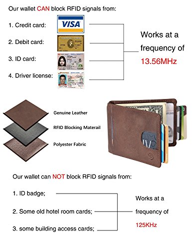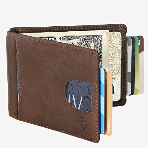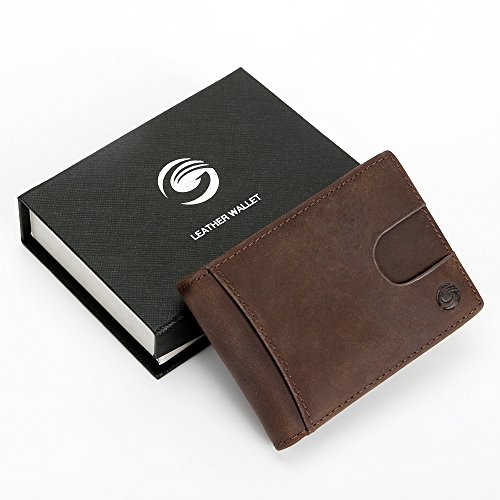 -. Feature : [Best Gift for boyfriend, husband, brother and father]: BESWILL finest Genuine Leather Wallet, Durable and Slim, RFID blocking, protect against the growing risk of electronic pickpocketing thieves, Front Pocket Wallet for Men, Money Clip, Come with a gift box, good choice as a gift / [Genuine Leather Wallet]: Made with the Finest Full Grain genuine leather, Durable, looks classy and very slim, Wallet Size: 4" in. x 3" in.x0.5" in / [Slim and Stylish Wallet]: Designed Quick Access ID Windows, Holds up to 10 cards plus US bills with no bulk, and a minimul Pull-tab design to reduce bulk / [Safe SECURITY RFID Blocking Protection Wallet]: Our wallets are equipped with advanced RFID SECURE Technology, a unique metal composite, engineered specifically to block 13.56 MHz or higher RFID signals and protect the valuable information stored on RFID chips from unauthorized scans / [HOW IT WORKS]: This wallet will meet your everyday needs. The wallet is equipped with a front pocket made for your most used card. 2 pockets on the inside, with a photo ID slot, and a money clip to hold your cash. Wallet case also has smart pull-strap for quick access to your everyday cards