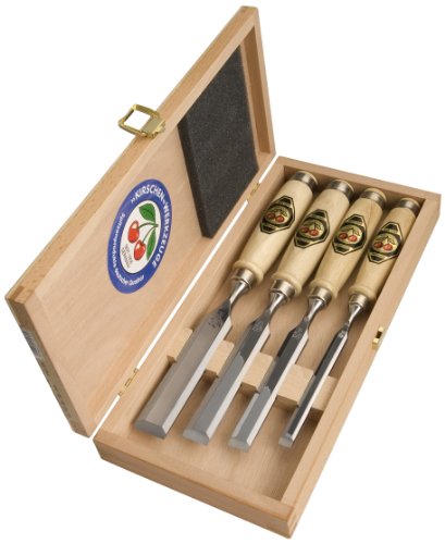 4tlg Stechbeitelsatz-Weißbuchenheft im Holzkasten