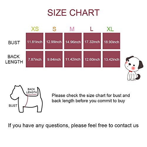 -. Feature : FIVE SIZES AVAILABLE -- XS, S, M, L, XL. Please measure back, chest and neck size of your pets before buying. ¡¾XS¡¿: Bust: 11.81inch, Back Length: 7.87inch. ¡¾S¡¿: Bust: 12.99inch, Back Length: 9.84inch. ¡¾M¡¿: Bust: 14.96inch, Back Length: 11.42inch. ¡¾L¡¿: Bust: 17.32inch, Back Length: 12.60inch. ¡¾XL¡¿: Bust: 18.90inch, Back Length: 13.39inch / PREMIUM MATERIAL --Foerteng pet pajama is made of premium soft cotton, will not hurt your baby pets' skin and prevent skin diseases. Prevent your dog have a cold when sleeping or playing / WELL MADE -- Four trouser legs with elastic waist, keep your baby pets warm during cool nights. Foerteng pet pajamas also have an open belly for easy potty time so you do not worry about it / CUTE PATTERN -- Foerteng design kinds of pajamas for your pet baby. Cute and fashion pattern will make your puppy or cat more charming. Certainly! She/he will get more love from her/his friends / SCOPE OF APPLICATION -- Suitable for small medium-sized pets