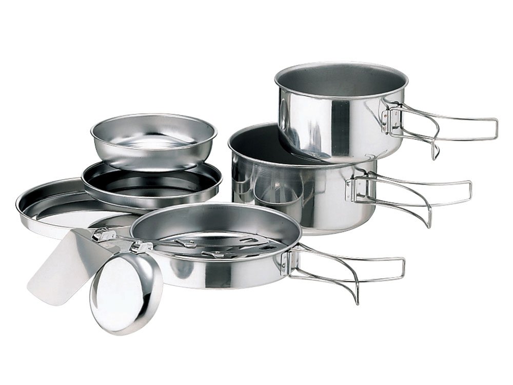 Titanium Personal Cooker and Aluminum Personal Cooker consist of Cooker L (1000 mL), S (780 mL), Lid and Frying Pans L and S 4 pieces.