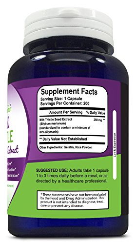 -. Feature : POTENT & EFFECTIVE: 250 mg of Milk Thistle per capsule standardized to contain 80% Silymarin. / SUPPORTS OPTIMAL LIVER HEALTH: Milk Thistle is believed to help detoxify the liver, support healthy liver function, and aid the liver's ability to regenerate healthy cells.* / HIGHEST QUALITY: Contains NO chemicals, preservatives, artificial color or flavor, magnesium stearate, dioxides, sugar, salt, starch, yeast, wheat, gluten, corn, soy, or milk. / MADE IN THE USA: Manufactured in an FDA approved, GMP compliant facility. / 100% HASSLE-FREE GUARANTEE: If you aren't satisfied for any reason, just contact us and we'll give you a full refund, no questions asked, and no need to return the bottle.