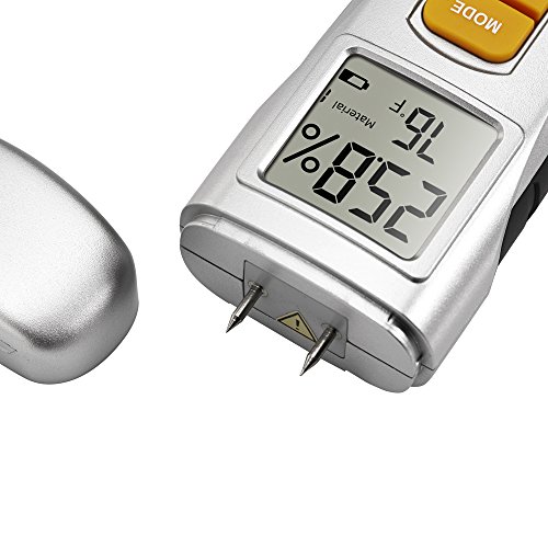 - Easy to use wood building materials moisture meter with 2 pins: stick the stainless steel pins into the surface of what you are measuring in order to get a read-out. Please use it correctly and carefully because the pins are too sharp. Low battery indication on the display and lock for moisture record. Powered by 1 * 9V(Battery not included. Package :1 * moisture meter ;1 * User manual).