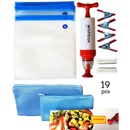 Wishbox Sous Vide bags kit for Anova, Joule, Chefsteps, Gourmia Immersion Precision Cookers. Accessories include -- 10 Reusable Bags (2 Sizes), 2 zip Sealer & 4 Container Clips, 1 Vacuum Hand Pump