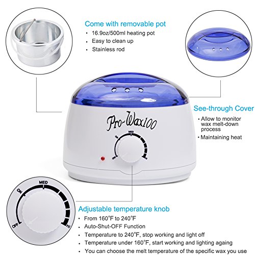 Usage of wax warmer: 1. Switch the wax warmer temperature to MAX 185℉, wait 15-25 minutes for the hard wax to melt. Please use a spatula to stir wax to accelerate the melting. 2. When all the wax beans have melted, please switch the wax warmer temperature between 110℉-125℉, and keep the wax at a constant temperature. 3. Carefully apply a little wax on your waist to test for a suitable temperature, then apply a thick layer of wax to the required body.