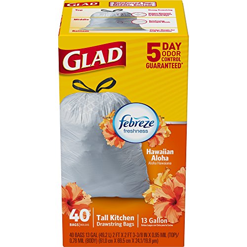 Product DescriptionGlad OdorShield Tall Kitchen Drawstring Trash Bags, Hawaiian Aloha, 40 Count0