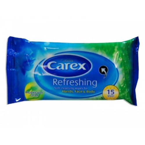 -. Feature : Carex Wipes leave your skin feeling soft, clean and cared for in a convenient way / Soft cleansing wipes for Hands, Face & Body / Pocket friendlub size / Hygienically clean / 15 wipes