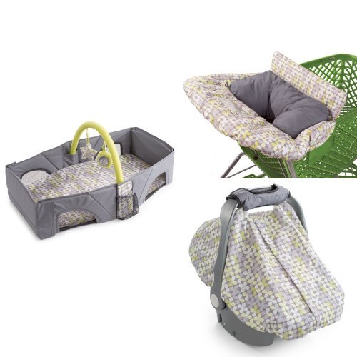 -. Feature : Includes Travel Bed, Car Seat Cover, and Cushy Cart Cover / Travel Bed: premium mattress pad for baby's comfort with a removable, washable sheet, fun toy bar with two toys to entertain baby while changing their diaper, easily folds with detachable carry strap for travel / Car Seat Cover: elasticized boarder snugly fits any car seat, sneak peek opening to check on baby without removing entire cover, cover easily stores in the arm pad pocket when not in use, works great in unpredictable weather conditions, breathable cotton blend fabric is machine washable / Cushy Cart Cover: infant positioner props younger babies up safe and securely and then easily removes as your child gets older, includes vinyl pocket to protect your smartphone while entertaining your child and two loops to attach toys, folds up easily and compactly turning into a pouch when not in use