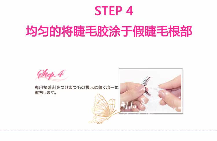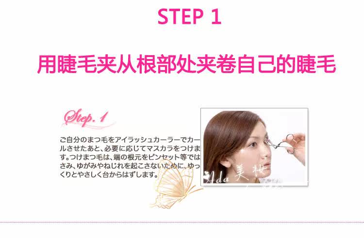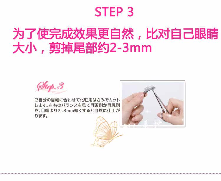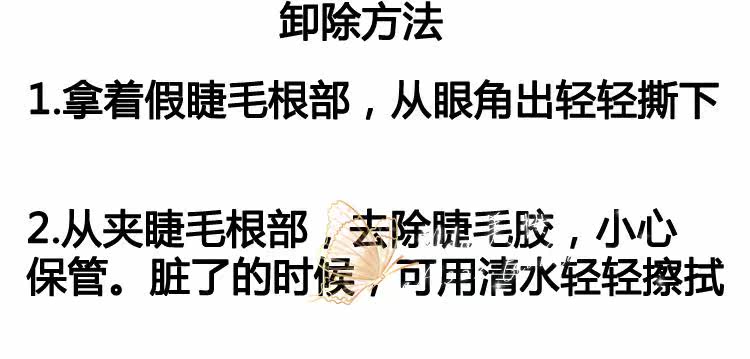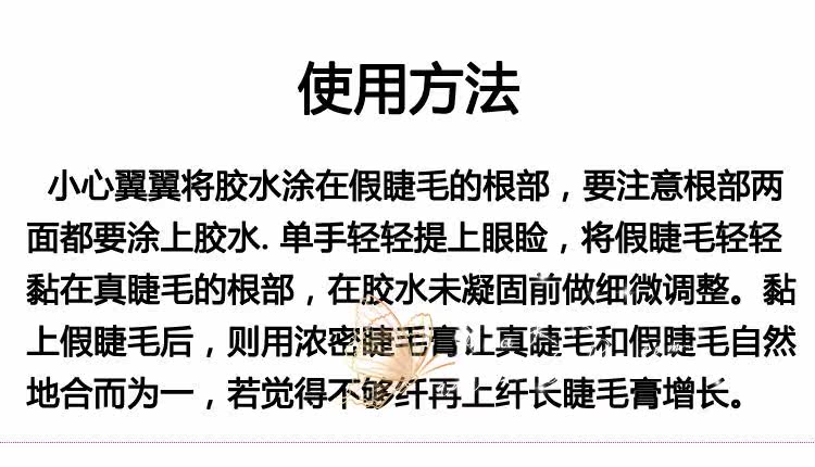 | 注意事项: | 1.产品限皮肤外部使用,使用时请小心,勿将胶水沾到眼睛里面,若黏上假睫毛后,眼睛有不舒服的状況,请立即取下。 此款假睫毛毛质较软,加上是透明梗,所以在拿取的时候请尽量小心,不要大力拉扯,否则有容易扯断的可能!! |