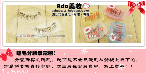 现在此款假睫毛有两种包装,有中文标签和无中文标签两种,有中文标签的是我们从香港专柜代购的,无中文标签是日本进口的,品质是一样的,因为目前中日关系不太稳定,所以从日本进货的话周期会很长,Ada就拜托在香港的同学帮忙代购的,品质是一样的,但是如果介意的亲就不要拍了,3Q~~