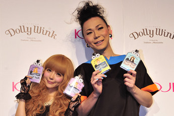 | ミッツ?マングローブさんがDolly Wink新商品発売の お祝いに駆けつけてくれました。 つばさチャンに合わせて?!黒の衣装で登場! Dolly Winkは女装家にも人気で 今日も2 枚重ねでつけているそう! |