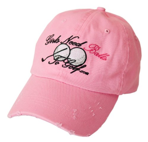 -. Feature : The coolest hat on the golf course, driving range or tooling around town / Hat is sporting the "Girls Need Balls to Golf" logo (Embroidery) / Six panels with eyelets is evenly distributed, Pre-curved visor, Factory plastic protective bags sealed on both sides, to keep hat clean / Adjustment cloth strap on the back w/Rustic antique brass buckle closure ensures a snug fit / Hat is adjustable to fit most size, Cool, Lightweight Cotton, MySack Hot Pink (distressed),
