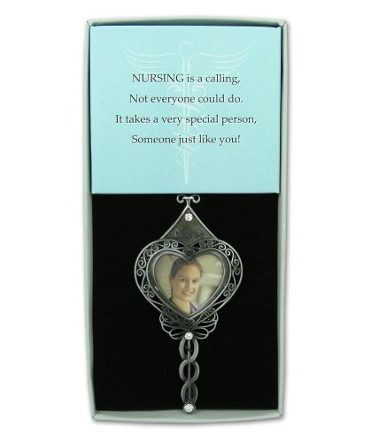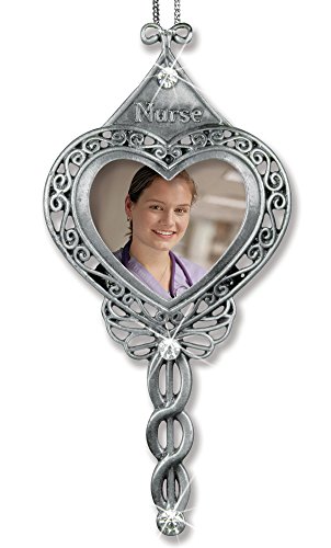 - HEART shaped nurse ornament with caduceus holds a 1.25" diam. photo. Vintage-look metal adorned with sparkling crystals