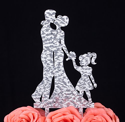 LOVENJOY Kissing Bride and Groom with Little Girl Silhouette Cake Topper w/ Gift Box (4.2-inch, Silver Glitter)
