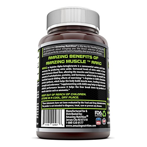-. Feature : GET MORE FROM YOUR WORKOUTS Arginine alpha ketoglutarate (AAKG) provides essential bodybuilding nutrition, promoting higher nitric oxide levels in the blood to enhance the effects of exercise* / ACHIEVE YOUR WORKOUT GOALS Arginine alpha ketoglutarate (AAKG) promotes protein synthesis and lean muscle development. It may also support strength gain & endurance* / HIGH POTENCY FORMULA Our AAKG Supplement provides approximately 3.5 grams of AAKG per serving. You will get approximately 60 servings in one bottle. / QUALITY All Amazing Muscle products are manufactured in accordance with Good Manufacturing Practices (GMP), among the highest standards in the world. / PURITY & POTENCY All our products are proudly made in USA with Guaranteed Purity & Potency. We offer best quality products for the best value. All our products are Third Party Tested. We do not compromise on quality, our products are free of Artificial Colors, Preservatives, or Flavors
