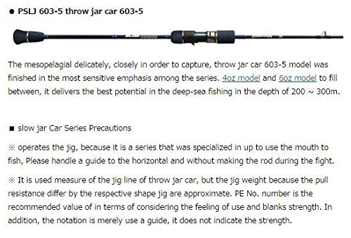 이것이 진짜 슬로우 피치 jerk 전용 로드! ●슬로우 밥통 카 시리즈 사용상의 주의※지그를 조작하고, 물고기로 입을 사용하게 하는 까지 특화 한 시리즈이므로,파이트 시에는 로드를 세우지 않고 수평까지를 기준으로 취급 하십시오.※슬로우 밥통 카의 지그 라인의 사용 기준이지만,지그 각각의 형상에 의해 끌어 저항이 다른 모아 둬 지그 웨이트는 기준입니다.PE호수는 blank《스》강도라고 사용감을 생각하도록 한 다음에 에서의 권장치입니다.또한표기는 어디까지나 사용 기준이고, 강도를 나타내 보이는 것 가(이) 아닙니다.