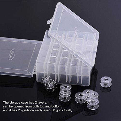 - Double layer storage case: the storage case has 2 layers, can be opened from both top and bottom, and it has 25 grids on each layer, 50 grids totally, allow you to keep these bobbins organized