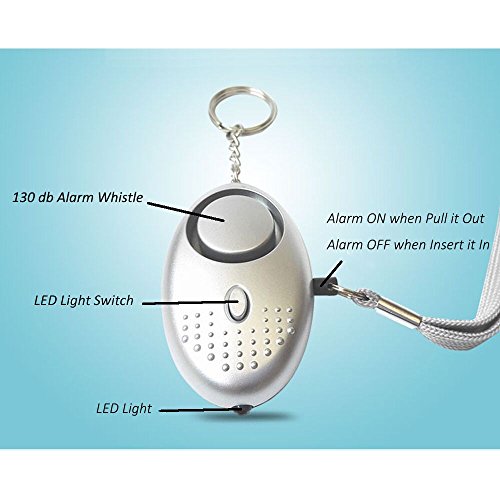 - 130 db Loud: This alarm we can use in many area, no matter who you are and where you are, 130 dB alarm helps call for assistance in an emergency and helps deter attacker. To sound the reusable alarm, simply pull out the switch pin from the device.
