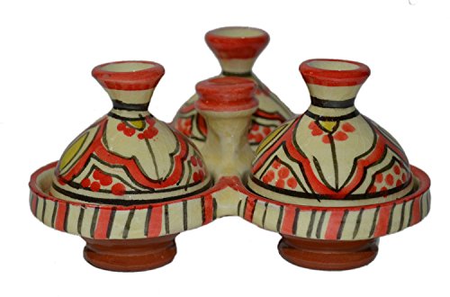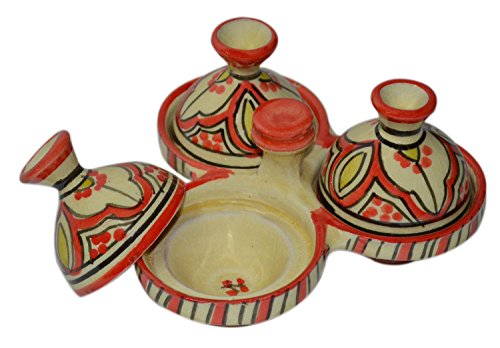 -. Feature : Handmade ceramic triple spicer 9 inches diameter by 3 inches high / Imported from Safi, Morocco / Unique style with vivid color perfect for salt, cumin and more. / shaped as a Moroccan Tagine / can be use also for your dipping sauces like yummy yummy sauce and more -. Label : Spice Tagines -. Manufacturer : Spice Tagines -. ProductGroup : Single Detail Page Misc -. ProductTypeName : POTTERY_AND_GLASS -. Publisher : Spice Tagines -. Studio : Spice Tagines -. Title : Moroccan Handmade Ceramic Triple Spices Sauce Dish Spices Container