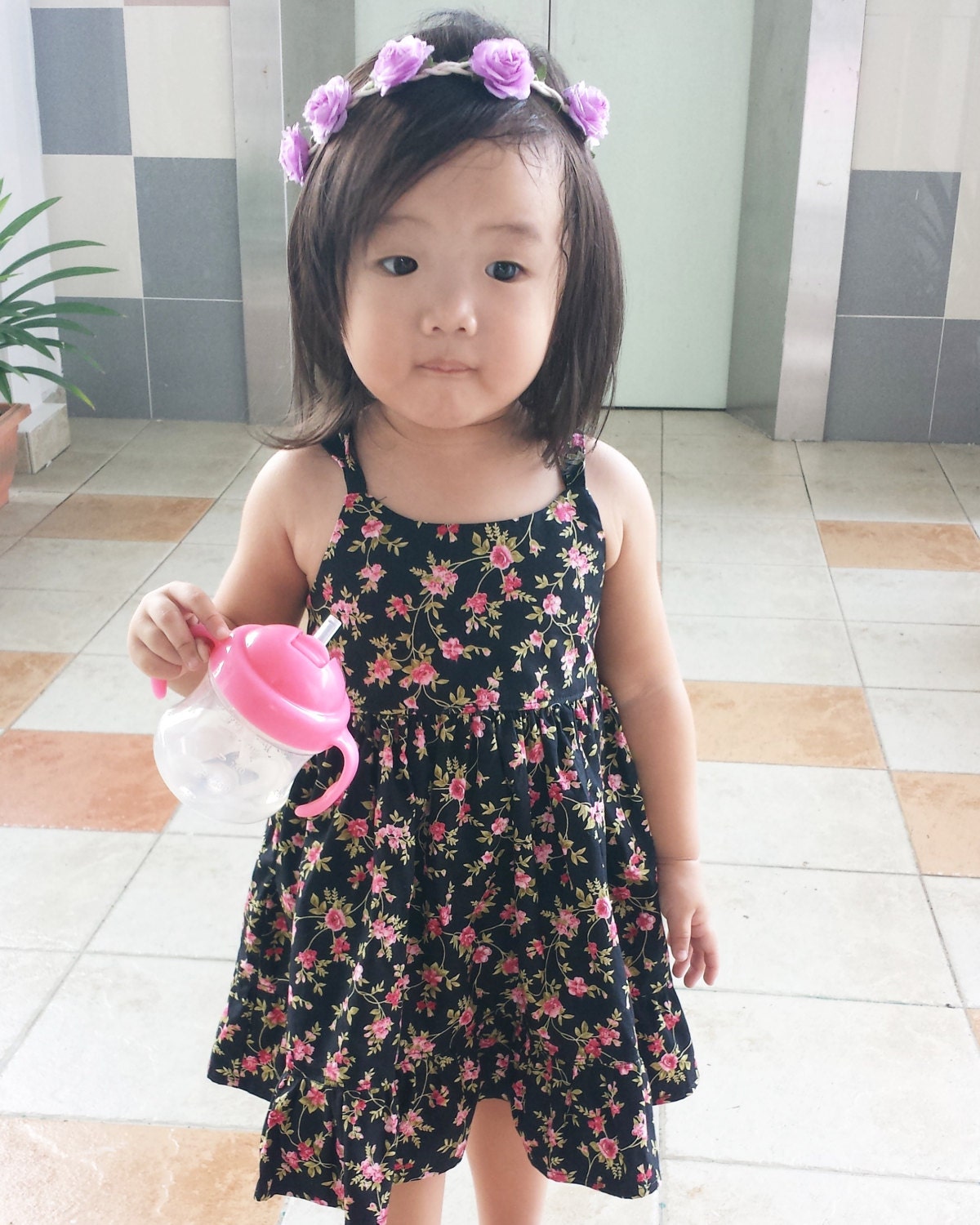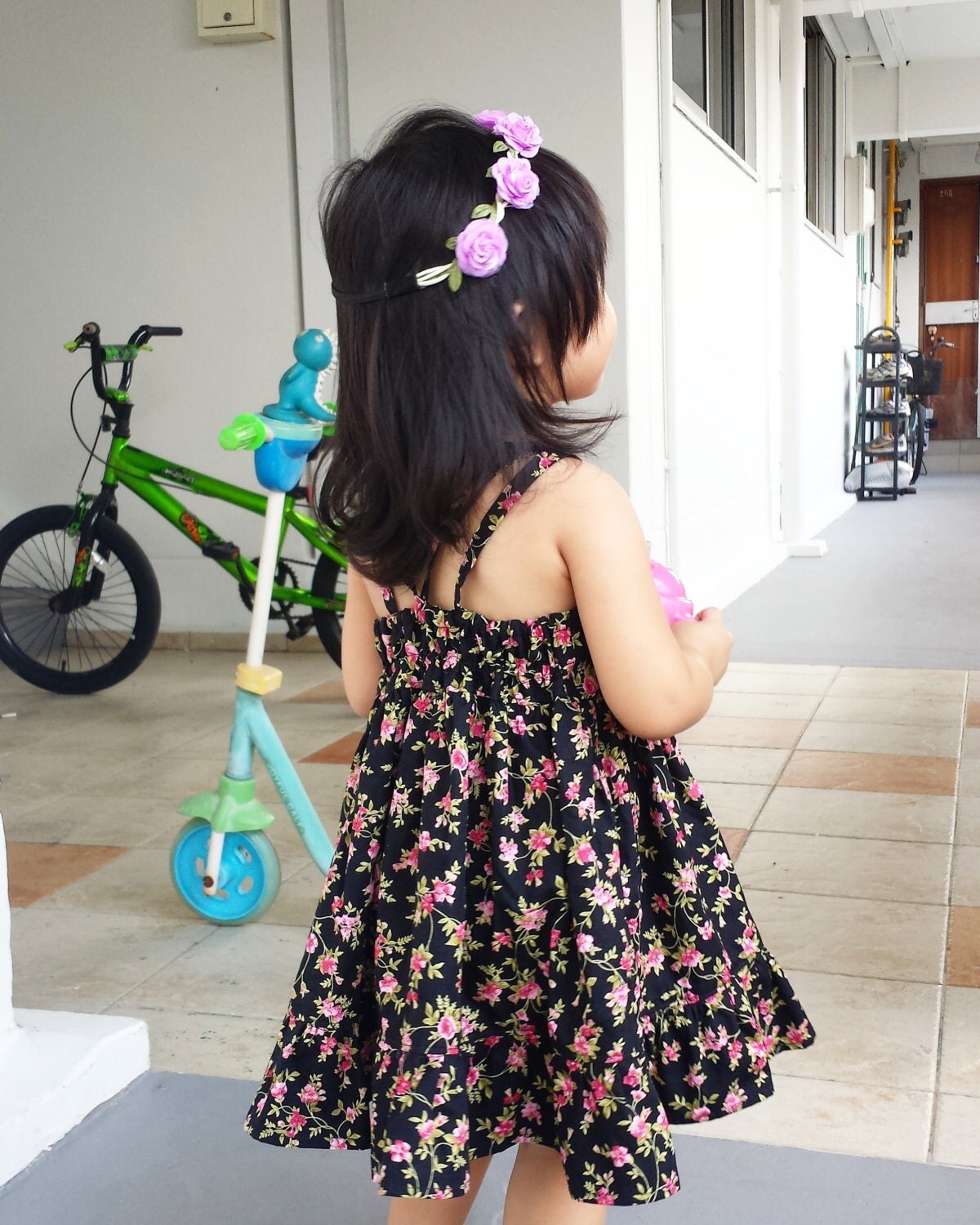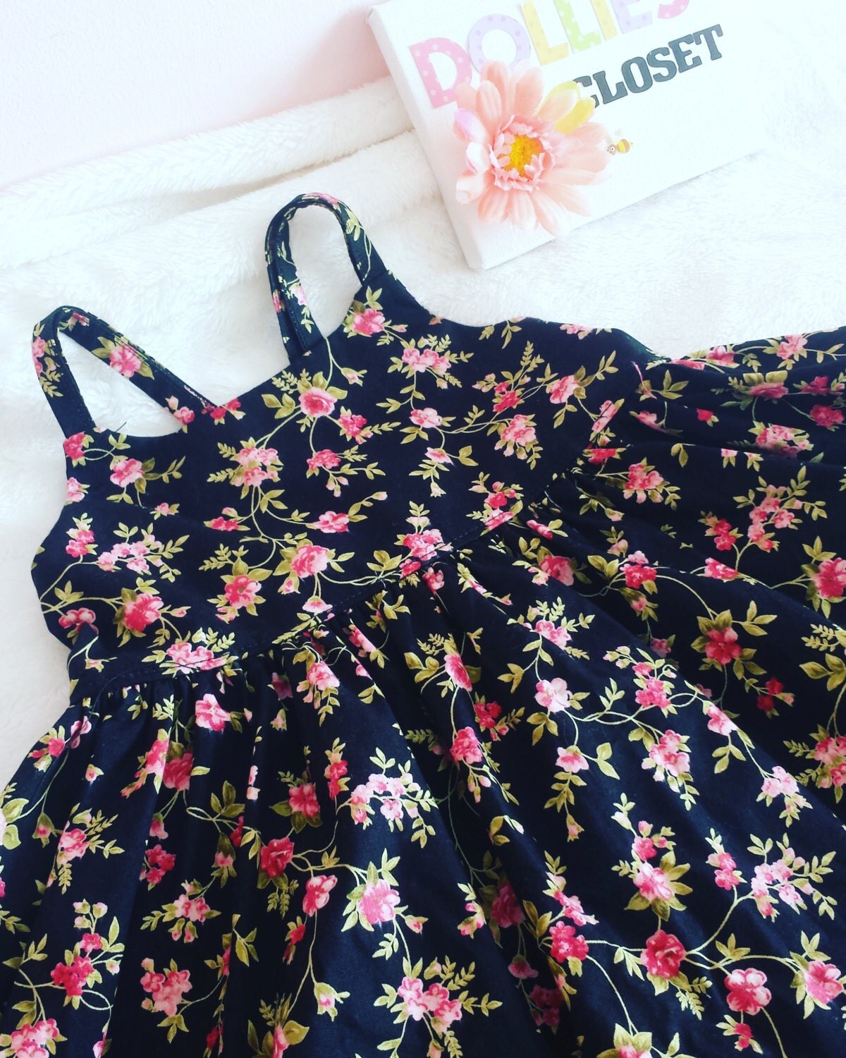 Lovely summer dress with strappy back design. Elastic back to ensure good fit. Made with black flora throw cotton.