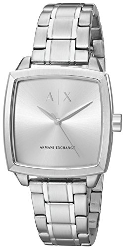 New for fall 2017, this fun and feminine Armani Exchange watch shines with a square-shaped stainless-steel case and brushed-and-polished single-link bracelet. A brushed silver dial with beveled index ring adds a sleek finishing touch.