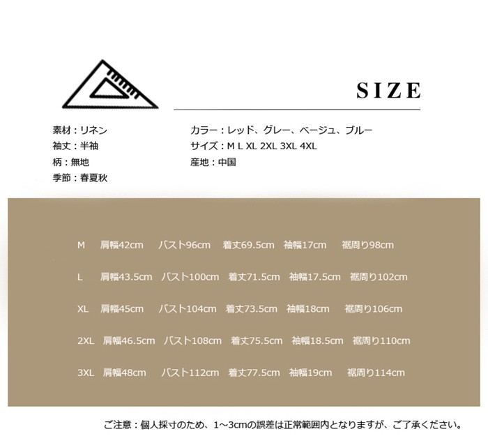 シャツ メンズ カジュアルシャツ メンズ 半袖 無地 トップス アウトドア 通勤 薄て リネンシャツ 大きいサイズ アメカジ 2018春夏新作 シャツ メンズ 半袖 無地 トップス アウトドア 通勤 大きめ商品詳細素材:リネン袖丈:半袖柄:無地季節:春夏秋カラー:レッド、グレー、ベージュ、ブルーサイズ:M L XL 2XL 3XL 4XL産地:中国サイズ参照表M 肩幅42cm バスト96cm 着丈69.5cm 袖幅17cm 裾周り98cmL 肩幅43.5cm バスト100cm 着丈71.5cm 袖幅17.5cm 裾周り102cmXL 肩幅45cm バスト104cm 着丈73.5cm 袖幅18cm 裾周り106cm2XL 肩幅46.5cm バスト108cm 着丈75.5cm 袖幅18.5cm 裾周り110cm3XL 肩幅48cm バスト112cm 着丈77.5cm 袖幅19cm 裾周り114cmご注意:個人採寸のため、1~3cmの誤差は正常範囲内となりますが、ご了承ください。シャツ メンズ カジュアルシャツ メンズ 半袖 無地 トップス アウトドア 通勤 薄て リネンシャツ 大きいサイズ アメカジ 2018春夏新作 シャツ メンズ 半袖 無地 トップス アウトドア 通勤 大きめ