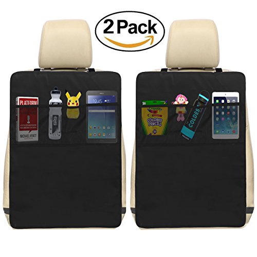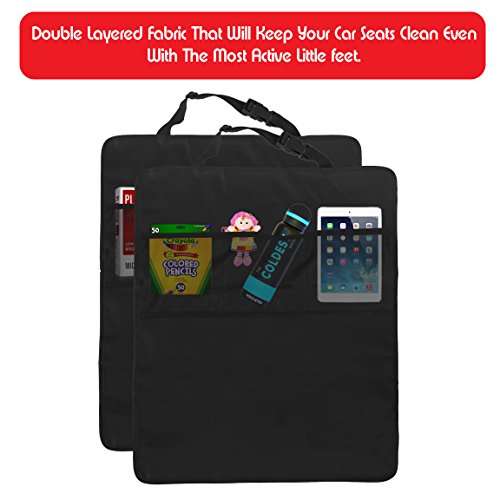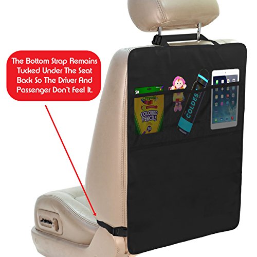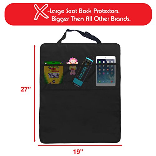 ► KEEP YOUR CAR ORGANIZED - With large maximum full coverage designed Kick Mats measuring 19" wide x 27" long (48cm x 68.5cm) it will protect your whole seat with a snug fit, And will work with most vehicles seats. Includes 3 organizer pockets on the front for handy storage of food, kids play toys, colouring and reading books, baby gear and accessories. Ensure that the things that are important are in reach of your kids at all times, and that the mess rolling around the floor is limited.