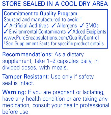 FREE FROM: Pure Encapsulations products are free from wheat, gluten, egg, peanuts, magnesium stearate, hydrogenated fat, artificial sweeteners and colors, and other unnecessary excipients. Any product containing ingredients derived from allergens, such as soy, dairy or shellfish is clearly labeled. * These statements have not been evaluated by the Food and Drug Administration. This product is not intended to diagnose, treat, cure, or prevent any disease.