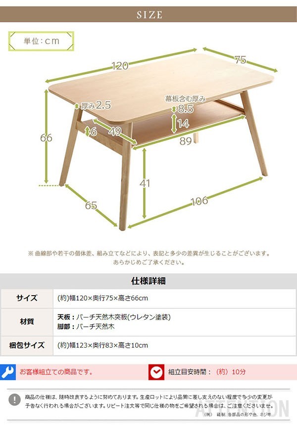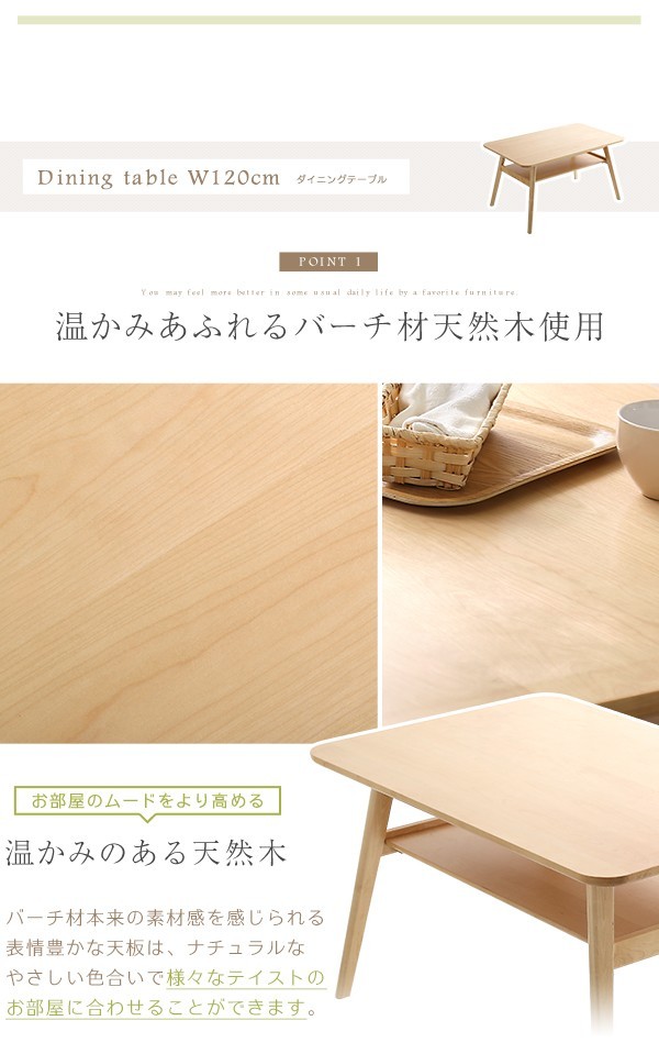 【商品について】ダイニングテーブル木製単品(幅120cm)バーチ材天然木使用のローテーブル|Famia-ファミア-■サイズ:外寸:(約)幅120x奥行80x高さ67.5cm※商品重量:(約)24kg■カラー:ナチュラル■素材:天板:バーチ天然木突板脚部:バーチ天然木■その他:・お客様組立商品です・梱包サイズ:幅123x奥行83x高さ10cm・梱包重量:(約)26kg
