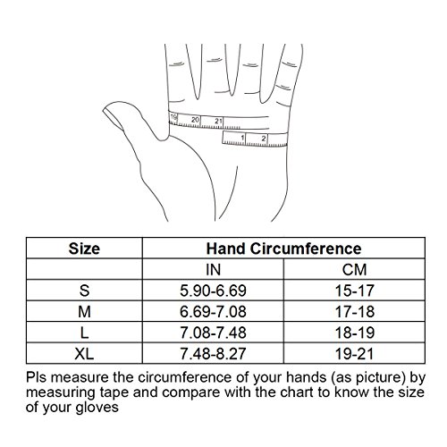 Size Chart: S: 6.3-7.1inch / 16-18cm M: 7.1-7.87inch / 18-20cm L: 7.87-8.66inch / 20-22cm XL:8.66-9.45inch / 22-24cm Pls measure the circumference of your hands (as picture) by measuring tape and compare with the chart to know the size of your gloves.