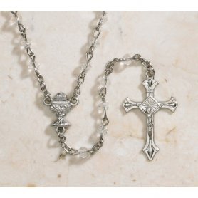 Girls 4 mm Glass First Communion Rosary, Chalice Centerpiece, Crucifix Charm, silver Plated, 17" L.