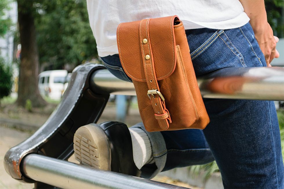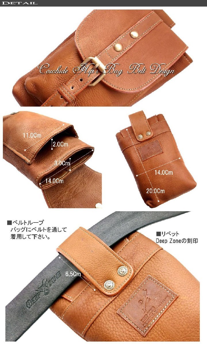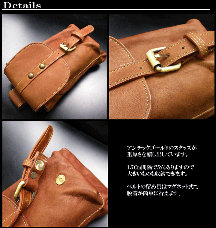 しっとりとした肌触りのよい上質のオイルレザーを使用し、丹念にハンドメイドで作りあげられたシンプルなヒップバッグです。フロントポケットはマグネットによる留め具になっていて、ベルトの留め具で5段階調節ができます。メインのポケットは開口口が大きくて出し入れが楽に出来ます。普段持ち歩く財布、スマートフォン、車のキーや手帳等の小物を収納してスタイリッシュに持ち運びできます。ループはリベットで固定されていますので、ベルトを通してから着用して下さい。シンプルマインドに可愛さと大人の高級感を表現しており、使い込むほどに深まるレザーの味わいを楽しめます。【サイズ】縦20.0cm × 横14.0cm【素材】牛革(本体)合金製(金具)【カラー】ブラック / ブラウン / ダークブラウン【仕様】カシメ式(ベルトを通してからの着用)