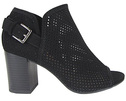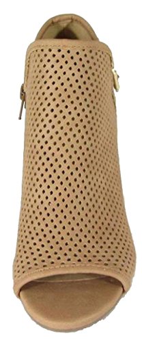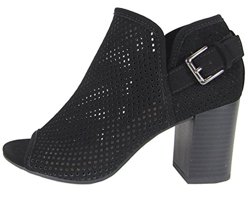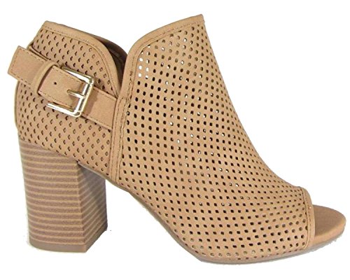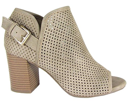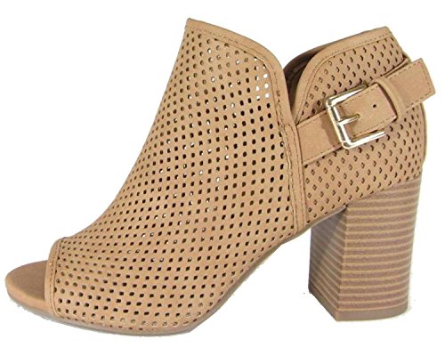 Product DescriptionDelicious Women's peep toe ankle booties feature vegan-friendly perforated detail with 4" stacked chunky heel. Imported.0