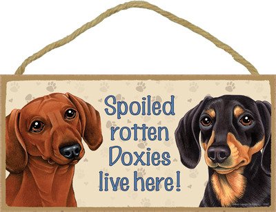 (SJT61997) Spoiled rotten Doxies live here (black & tan and red-brown Dachshunds) wood sign plaque 5" x 10"
