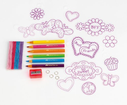 -. Feature : Make 4 Bracelets / Average Creativity Time 30 Minutes / 12 pre-cut Shrinky Dink Designs ,6 Faber-Castell colored pencils / Pencil sharpener, 4 yards of cotton cord / 4 Jump rings, instructions