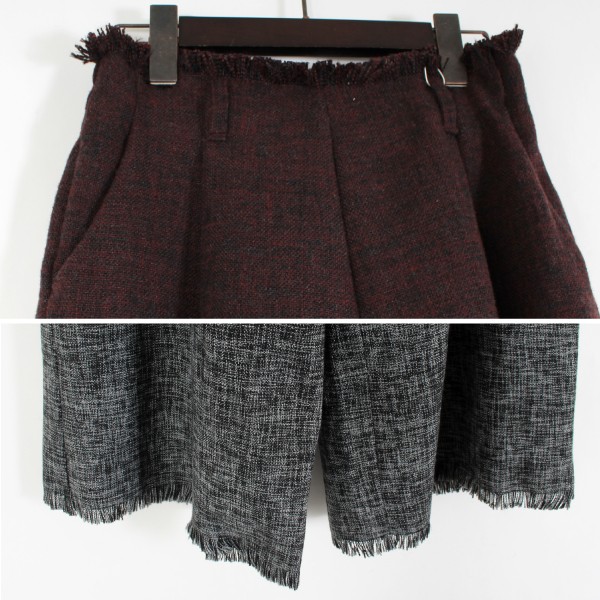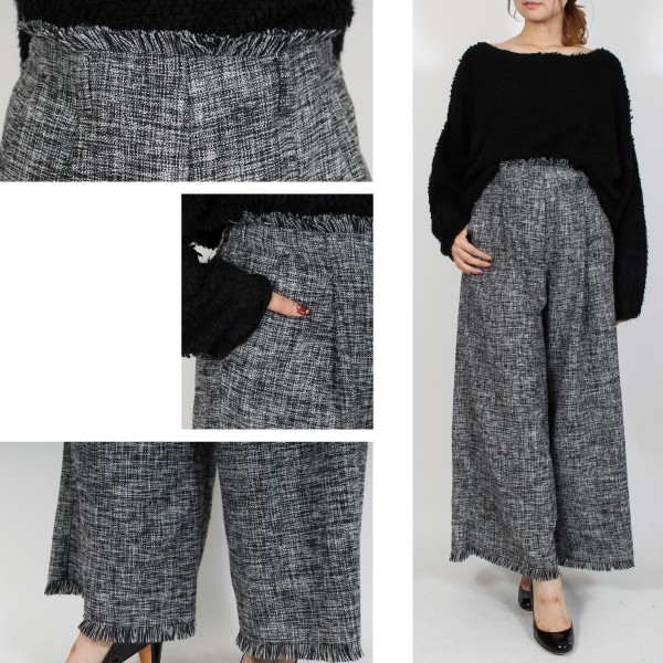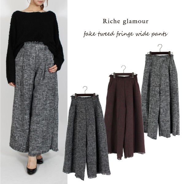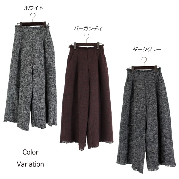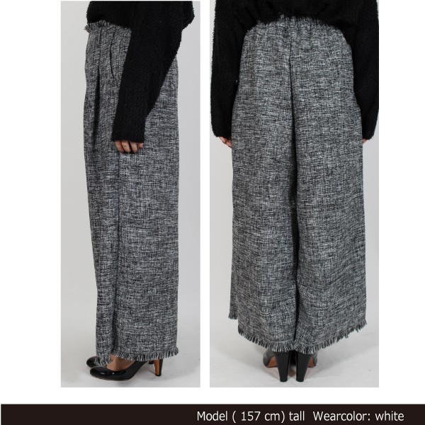 フェイクツイードのフリンジ・ワイドパンツ☆フリンジ使いが今期らしい逸品!!、合わせやすいカラー展開でトレンドスタイルを楽しめるおすすめカジュアルアイテムです★(裏地付きです)Mサイズ