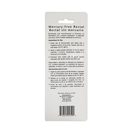 PRODUCT SPECIFICATIONS: Package contains (1) Geratherm Mercury Free Rectal Glass Thermometer. Color coded red for rectal. Tapered tip for easy insertion. Proven clinical accuracy. Easy to read. Dual scale – Fahrenheit and Celsius. Bilingual packaging and instructions. Lifetime warranty. FDA listed. Easy to disinfect or sterilize. Protective case included.