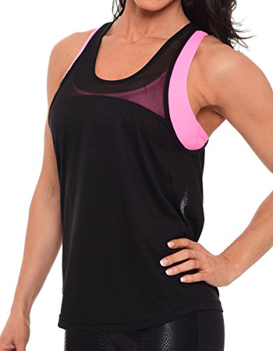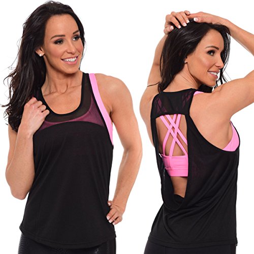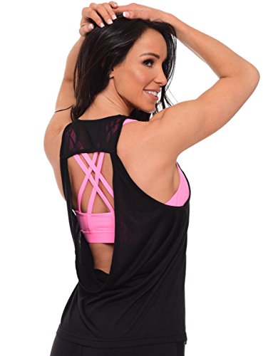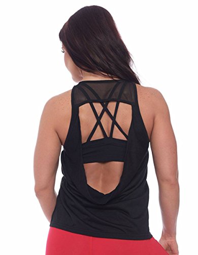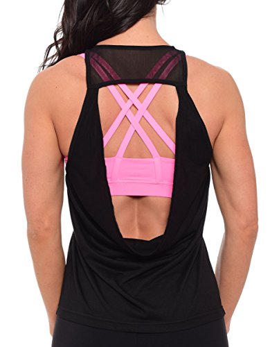 Black Flowy Yoga Workout Tank Top with Mesh and Open Back