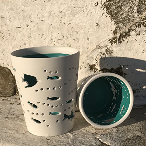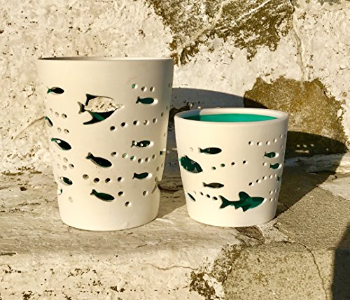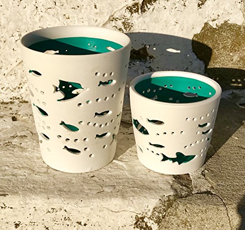 Studio : Whole House Worlds Publisher : Whole House Worlds Binding : Kitchen Product Description BY LAND OR BY SEA, if it's the lure of the lake or the call of the sea, inspire amazing evenings full of magical ambiance with Beach Chic Fish Wind Lights. Sold as a set of 2, simply add your own votive wax or LED candles inside to create a cool coastal vibe. CRAFTED BY HAND of white porcelain bisque, each piece in this set depicts a whimsical and relaxed pattern of a fish and guppies swimming in a current of water. Made so that each fish acts as a tiny window, the inside of these pieces are coated with a brilliant turquoise blue finish that is designed to capture and reflect flickering candle light. WELL SIZED for table tops, these proportioned pieces measures as follows: 1 - larger: 3 ½ diameter x 4 ¼ high, and 2 - smaller 3 diameter x 2 3/4 high inches. VERSATILE Designed to pair with a variety of themes, these versatile pieces are especially well suited for creating dynamic table top centerpieces. AN IDEAL GIFT, it's perfect to celebrate holidays, birthdays, weddings and many more. So gorgeous, you'll want to keep it at home for yourself. Enjoy! By Whole House Worlds Welcome to the product line of Whole House Worlds. The New York based company offers high quality, stylish products for every room in the house, and beyond. From the kitchen, to the living room, to the bedroom, dining room, home office, closet and garden: Our criteria are comfort, quality, style and value. 0