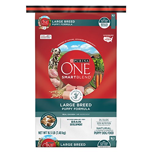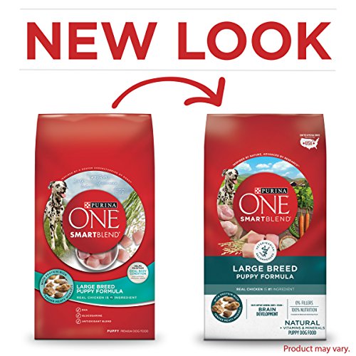 Give your large breed puppy the nutrition he needs to get a great start in life with Purina ONE SmartBlend Large Breed Puppy Formula dry puppy food. Real chicken is the #1 ingredient in this dry puppy food, so you can rest easy knowing he's getting a meal made with high-quality ingredients. This recipe features easily digestible nutrition with rice for your puppy's delicate stomach. Natural sources of glucosamine in every serving help to support his growing joints, and high protein in every serving help to support his strong muscles and heart. The protein-rich, tender and meaty morsels and crunchy kibble combine to deliver a taste and texture he's sure to love with every bite. Serve your growing large breed puppy a meal option that helps maintain his ideal body condition and gives him the nutrition he needs to live a healthy life with you.IngredientsChicken, Brewer's Rice, Soybean Meal, Corn Gluten Meal, Poultry By-Product Meal (Source of Glucosamine), Whole Grain Wheat, Whole Grain Corn, Animal Fat Preserved with Mixed-Tocopherols, Pea Fiber, Fish Meal (Source of Glucosamine), Animal Digest, Glycerin, Dried Egg Product, Fish Oil, Salt, Calcium Carbonate, Calcium Phosphate, Caramel Color, Potassium Chloride, Vitamin E Supplement, Potassium Citrate, Choline Chloride, Zinc Sulfate, L-Lysine Monohydrochloride, Ferrous Sulfate, Sulfur, Manganese Sulfate, Niacin, Vitamin A Supplement, Copper Sulfate, Calcium Pantothenate, Thiamine Mononitrate, Vitamin B-12 Supplement, Pyridoxine Hydrochloride, Garlic Oil, Riboflavin Supplement, Calcium Iodate, Vitamin D-3 Supplement, Folic Acid, Menadione Sodium Bisulfite Complex (Source of Vitamin K Activity), Biotin, Sodium Selenite. C-4179.