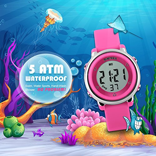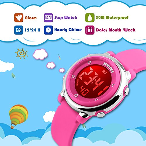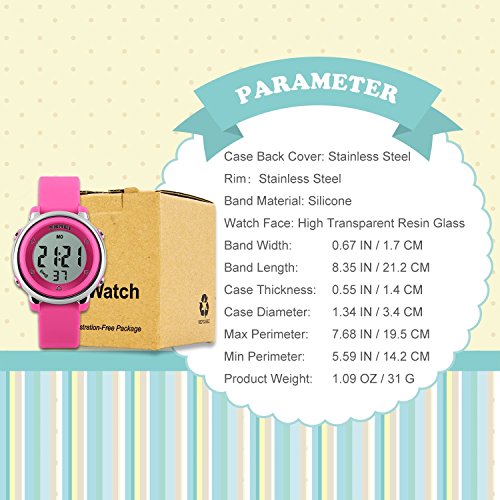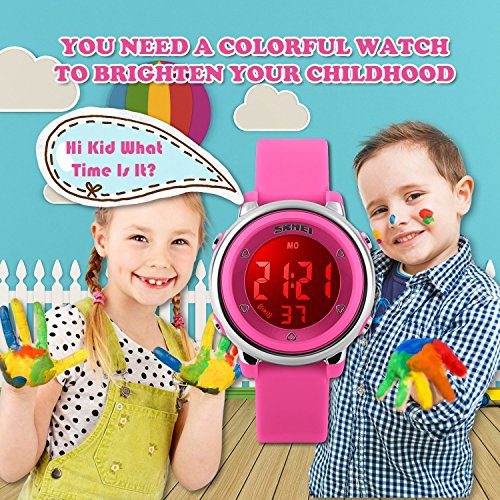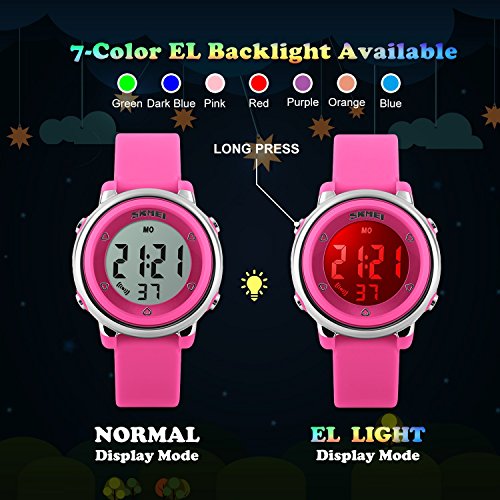SEVEN BACKLIGHT COLORS: Use imported LED Colorful LED lights, just press the backlight button on the left, you can clearly see the time at night. dark blue, green, red, sky blue, orange, pink, purple, these seven backlight colors can be adjusted when you hold down the upper-left backlight button for two seconds, this can satisfy the child's curiosity.