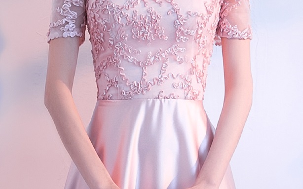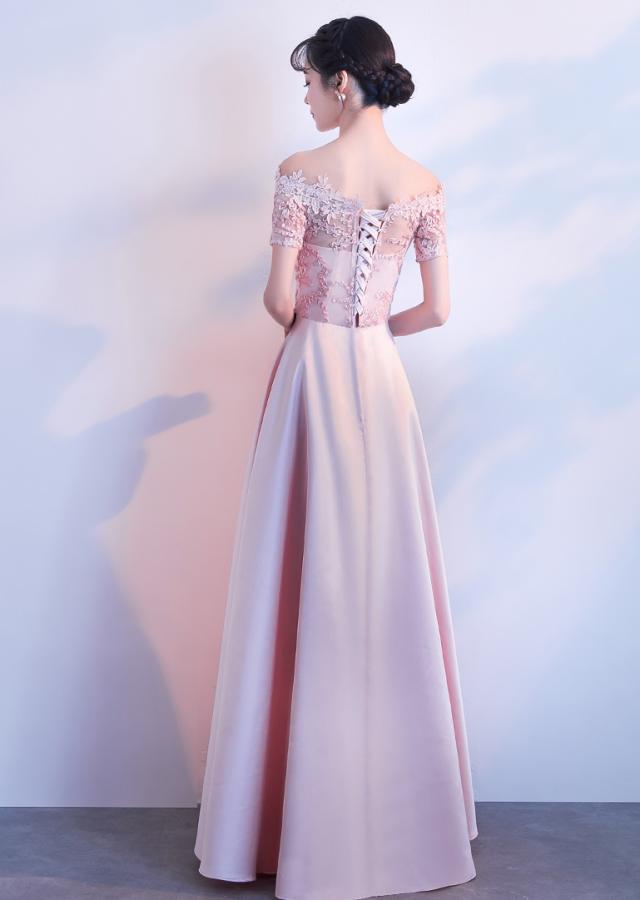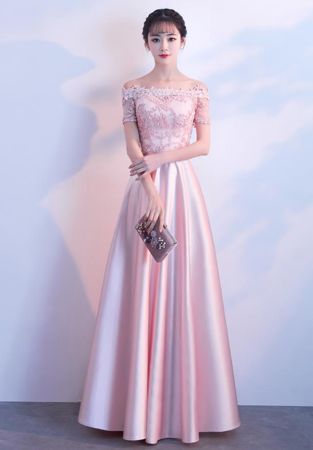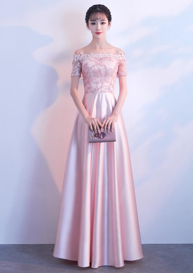 パーティー、お呼ばれにピッタリな、レースとサテンのロングドレスです。