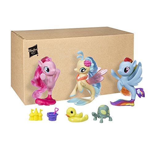 Imagine a movie-inspired undersea party with this seapony collection set! The set comes with Princess Skystar, Pinkie Pie, and Rainbow Dash seapony figures. Keep the undersea fun going with her pet turtle figure and 4 fun accessories including a sandcastle, duck innertube, seashell shovel, and pail. My Little Pony and all related terms are trademarks of Hasbro. My Little Pony: The Movie. Copyright 2017 My Little Pony Productions, LLC. Licensed by Hasbro.Feature