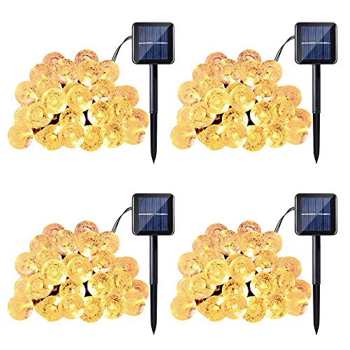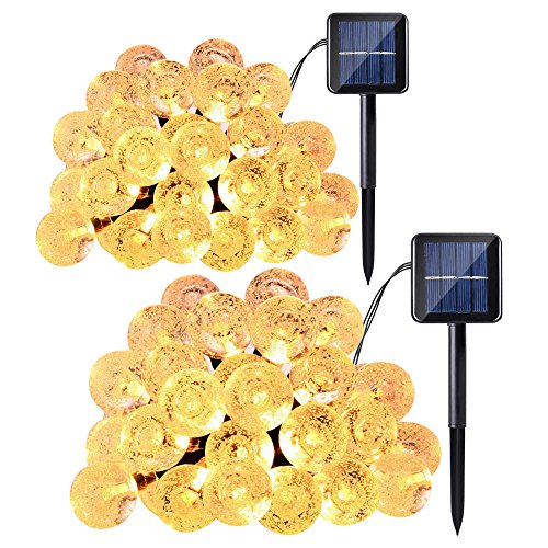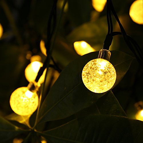Features Solar powered, no utility energy costs Charges even on cloudy days, turns on at dusk automatically Easy installation and operation Specifications LED Color: Warm White LED Quantity: 30 Rechargeable Ni-MH Battery: 1.2V 600mA Switch: Power ON/OFF& MODE Lighting Mode: Steady ON / Flashing Solar Panel: 2V 100mA Charging Time: 6 hours Light Length: 20ft(6m), 5ft lead cable included Length between 2 bulbs: 0.5ft (0.15m) Length from Solar panel to first stake: 5ft (1.5m) Solar panel with ground stake for easy positioning Warm Tips: Solar Light will have best performance, when you place it in an open area with direct sunlight most of the day. To get better performance, we recommend 100% charged before your first use. What's in the box 1 x Qedertek Globe String Lights 1 x Solar Panel with Ground Stake 1 x User Manual.Feature