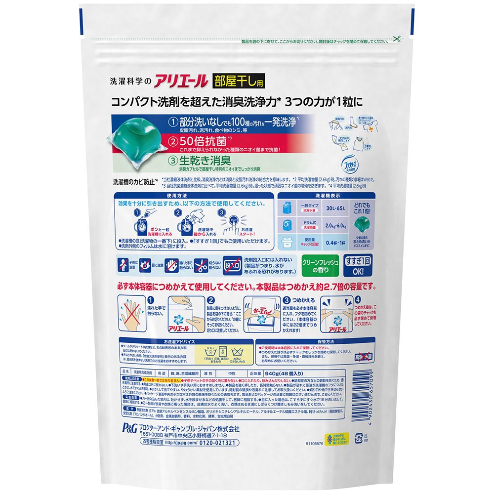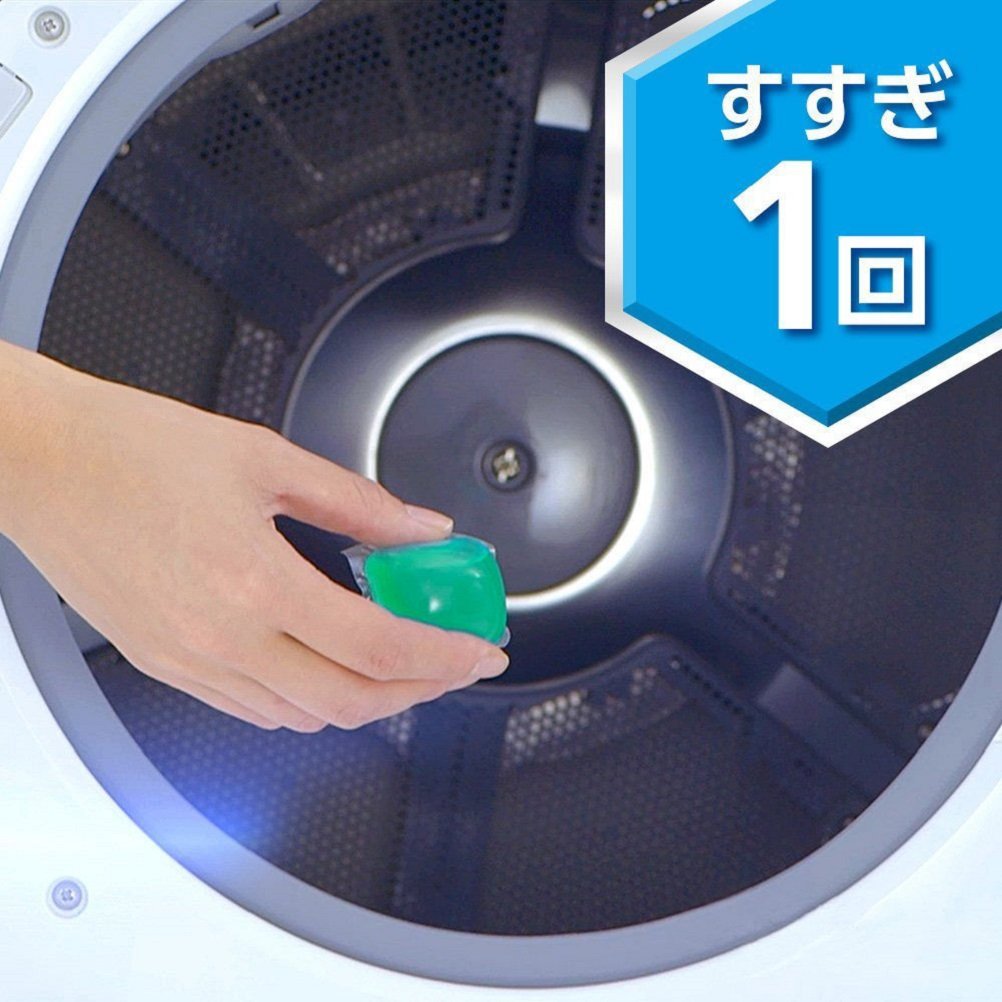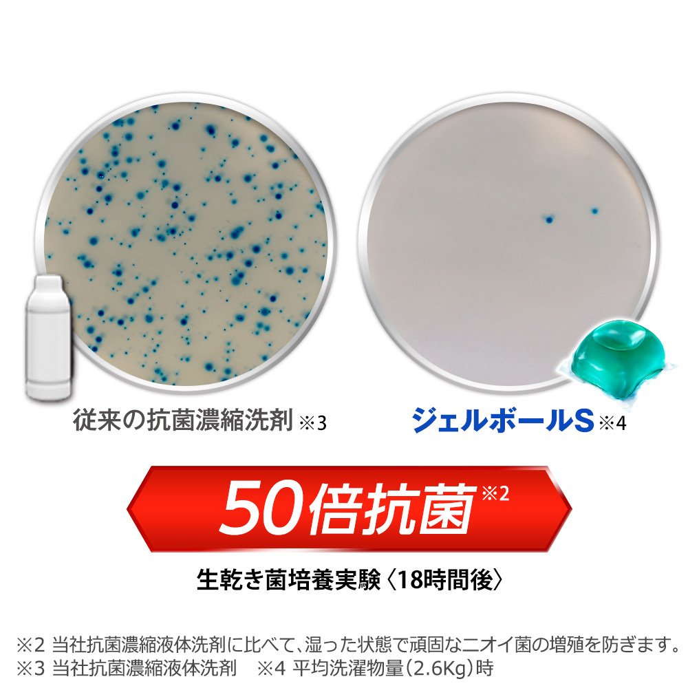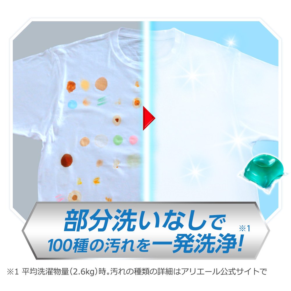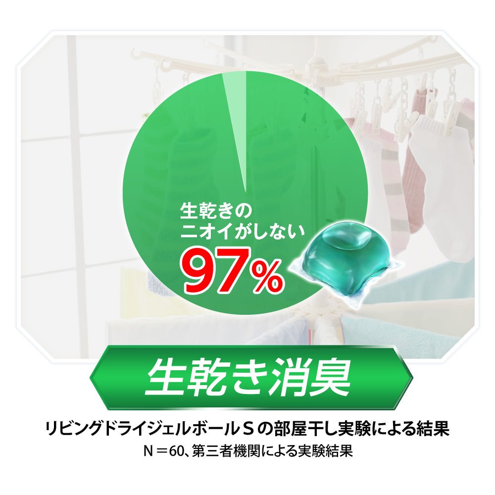 通常の2倍* 超ジャンボサイズ。* *アリエールリビングドライジェルボールSつめかえ用(18個入り)対比 部分洗いなしでも、100種の汚れを一発洗浄*1 ジェルボールSは、一粒でコンパクト洗濯洗剤以上の強力な消臭洗浄力*2を発揮。 生乾き消臭の3つの効果を実現。毎日の部屋干しに最適。 50倍抗菌*3 従来の抗菌濃縮洗剤*4では抑えられなかった生乾菌まで抑えるアリエール独自のデュアルバイオ抗菌処方。 生乾き消臭 消臭カプセルで部屋干し特有のニオイまでしっかり消臭 ●計量いらずで一粒ポンと入れるだけ。 ●30L~65L(2.0kg~6.0kg)のお洗濯に適しています。 ●全自動洗濯機・ドラム式洗濯機 OK。 ●従来の液体洗剤つめかえ用とほぼ同じ回数使えます。*5 ●すすぎ1回OK。 ●クリーンフレッシュの香り ●洗濯槽のカビ防止*5 *1汚れの種類の詳細はWebで *2当社濃縮洗剤と比較。 消臭洗浄力とは消臭と皮脂汚れ洗浄の総合力を意味します *3当社抗菌濃縮洗剤に比べて。 *4当社抗菌濃縮洗剤 *5平均洗濯物量(2.6kg)縦型洗濯機使用 製品を安全にお使いいただくために 子供の手の届かないところに置いてください