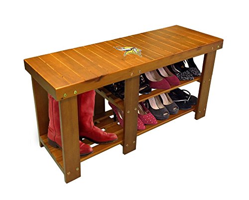 -. Brand : The Furniture Cove -. Feature : Walnut Finish / Features a Your Choice of Football Logo / Bench with 2 shelves underneath seat! / Space to fit boots under seat! / Dimensions: 35.5" Long x 13" Deep x 18" Tall -. Label : The Furniture Cove -. Manufacturer : The Furniture Cove -. ProductGroup : Furniture -. ProductTypeName : HOME_FURNITURE_AND_DECOR -. Publisher : The Furniture Cove -. Studio : The Furniture Cove -. Title : Walnut Finish Shoe Storage Bench Featuring the Choice of Your Favorite Football Team Logo